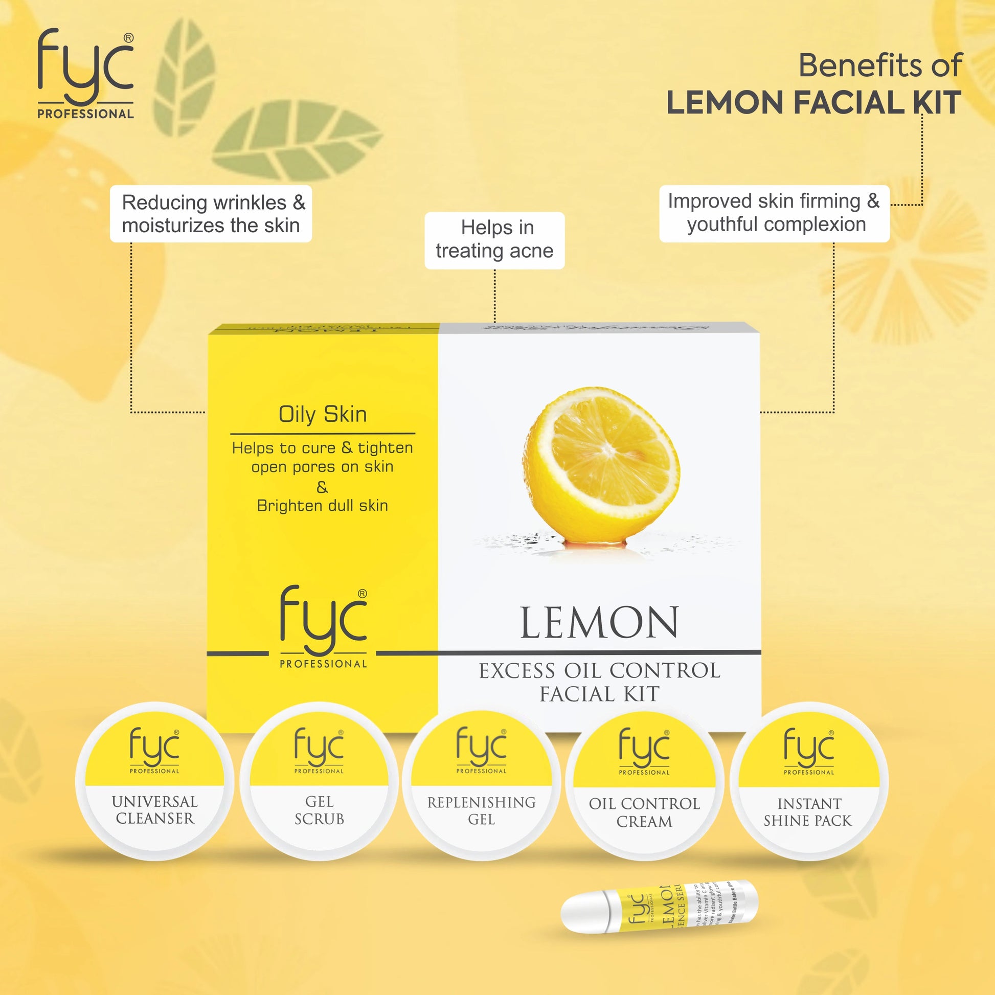 The FYC PROFESSIONAL Lemon Excess Oil Control Facial Kit (260g) is a complete 6-step skincare solution designed specifically for oily, acne-prone, and pigmented skin. Infused with the brightening and astringent properties of lemon, this facial kit helps to regulate excess oil, reduce pigmentation and acne scars, and bring out a luminous, even-toned glow. Enriched with Vitamin C, Aloe Vera, Neem, and botanical extracts, it provides deep cleansing, exfoliation, nourishment, and hydration while keeping your skin matte, fresh, and radiant.